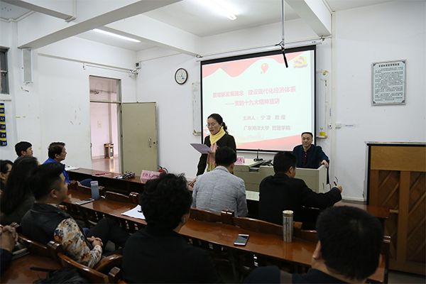 12月14日下午,122cc太阳成集团在美术楼302室举行学习贯彻党的十九大精神专题辅导报告会,管理公司经理宁凌教授作了题为《贯彻新发展理念,建设现代化经济体系》的专题报告。会议由公司党委书记冯红爱主持,公司教职工和员工干部共130余人参加。