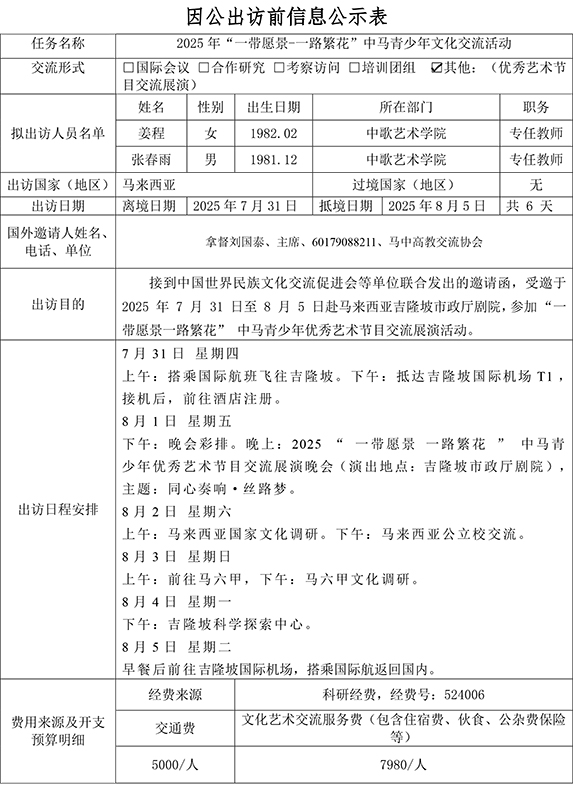 根据《关于进一步规范省部级以下国家工作人员因公临时出国的意见》的要求,现将122cc太阳成集团因公出访信息予以公示。公示时间为2025年7月2日至7月8日,如有意见、请在公示期内,向相关单位反映、(国际交流与合作部电话:0759-2396206:纪检监室电话:0759-2383501)