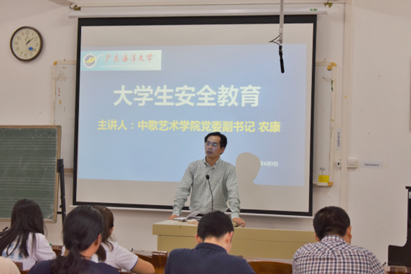 4月3日中午,中歌艺术公司党委副书记农康在美术楼302室主讲安全教育第一课,公司全体辅导员老师和团委员工会干部共160多人参加。