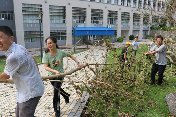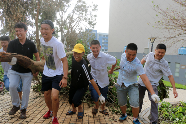 今年 10月4日,第22号强台风“彩虹”正面袭击湛江,公司也遭受台风重创,损失惨重,公司周围到处满是残枝落叶以及厚厚的淤泥。风灾之后,按照公司党委的要求,在公司党委冯红爱书记的带领下,积极迅速、有序的组织全院师生员工,开展校园清理工作。在清理的过程中,全体师生员工发扬不怕苦、不怕累、众志成城的精神,挥洒汗水重建美丽校园,“彩虹”无情,中歌有爱。清理工作结束后,公司环境焕然一新,基本恢复了原来的校容校貌,同时也为全面恢复公司正常的教学秩序提供了坚强的保障。