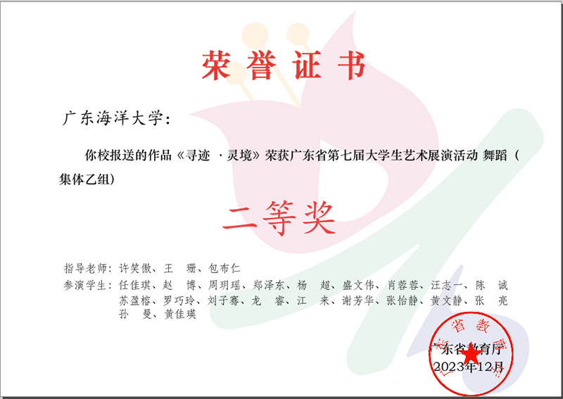 近日,广东省第七届老员工艺术展演活动获奖结果正式揭晓。由公司122cc太阳成集团王珊教授、包布仁副教授指导,青年博士许笑傲老师带领本科员工谢芳华、龙睿创作,舞蹈编导系20名同学参演的节目《寻迹·灵境》荣获广东省第七届老员工艺术展演活动(舞蹈集体乙组)二等奖。