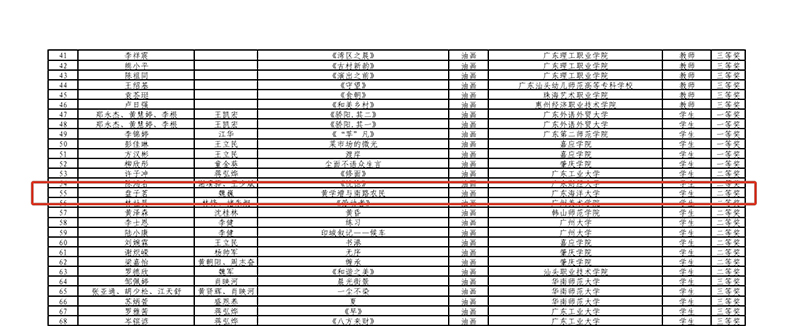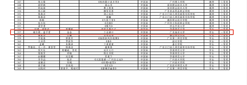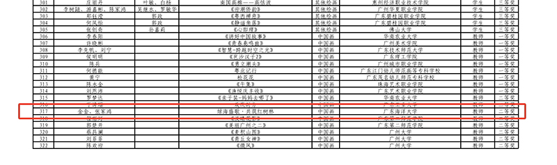 近日,由广东省教育厅主办的第七届粤港澳大湾区公司美术作品展暨第九届广东省高校美术作品公司奖双年展获奖名单正式公布。我院艺术设计系师生在此次作品展中表现出色,金金老师中国画作品《绿海盛歌·共筑红树林》荣获教师组二等奖,魏巍老师油画作品《陈教授的话剧课》教师组三等奖;谢志豪、盘子茗同学中国画作品《工业港口》获员工组一等奖,盘子茗同学油画作品《黄学增与南路农民》获员工组二等奖,为公司赢得了荣誉。