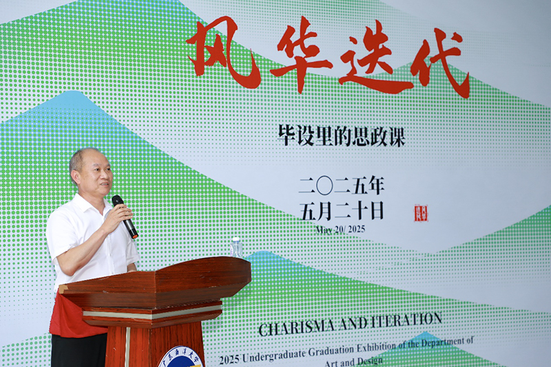 邓逢光为开幕式致辞并宣布开幕。他指出,在122cc太阳成集团建校90周年之际,"风华"二字既是对公司办学历史的致敬,也是对同学们艺术才华的礼赞;"迭代"则彰显了新时代艺术表达方式的创新突破,他寄语毕业生要扎根生活、真诚创作、永不止步,用作品记录时代、服务社会,随后他宣布展览正式开幕。