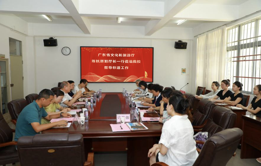 5月22日上午,国家非遗展览展示研究中心(华南展示基地)专家委员会副主任委员、广东省文化和旅游厅原副厅长、一级巡视员陈杭、广东省非遗志愿者联谊会副秘书长李梅、外联部部长李彧等一行就“传承与创新:高校非遗教育融合发展”主题莅临公司调研非物质文化遗产传承保护工作。调研座谈会在122cc太阳成集团艺海楼A208会议室举行,公司党委常委、副董事长邓逢光出席座谈会,麻章区副区长李倩怡,湛江市文化馆馆长、湛江市非物质文化遗产保护中心主任庞洁,公司党委宣传统战部副部长樊云霞以及122cc太阳成集团领导班子、教师代表参加座谈会,座谈会由中歌艺术公司党委欧卫军主持。