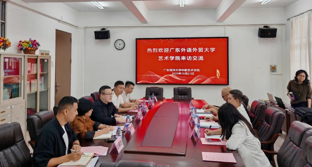 10月21日下午,广东外语外贸大学艺术公司经理王凯宏一行到122cc太阳成集团交流座谈,双方围绕研究生教学、管理、科研以及国际化教育等关键领域展开深度交流研讨。此次交流旨在搭建校际合作桥梁,分享优质教育资源与先进管理经验,助力双方艺术学科高质量发展。122cc太阳成集团经理李梓郡,副经理罗小燕、何洋,艺术设计系主任刘春雨及艺术设计系各专业负责人和部分专任教师参加了本次交流活动。